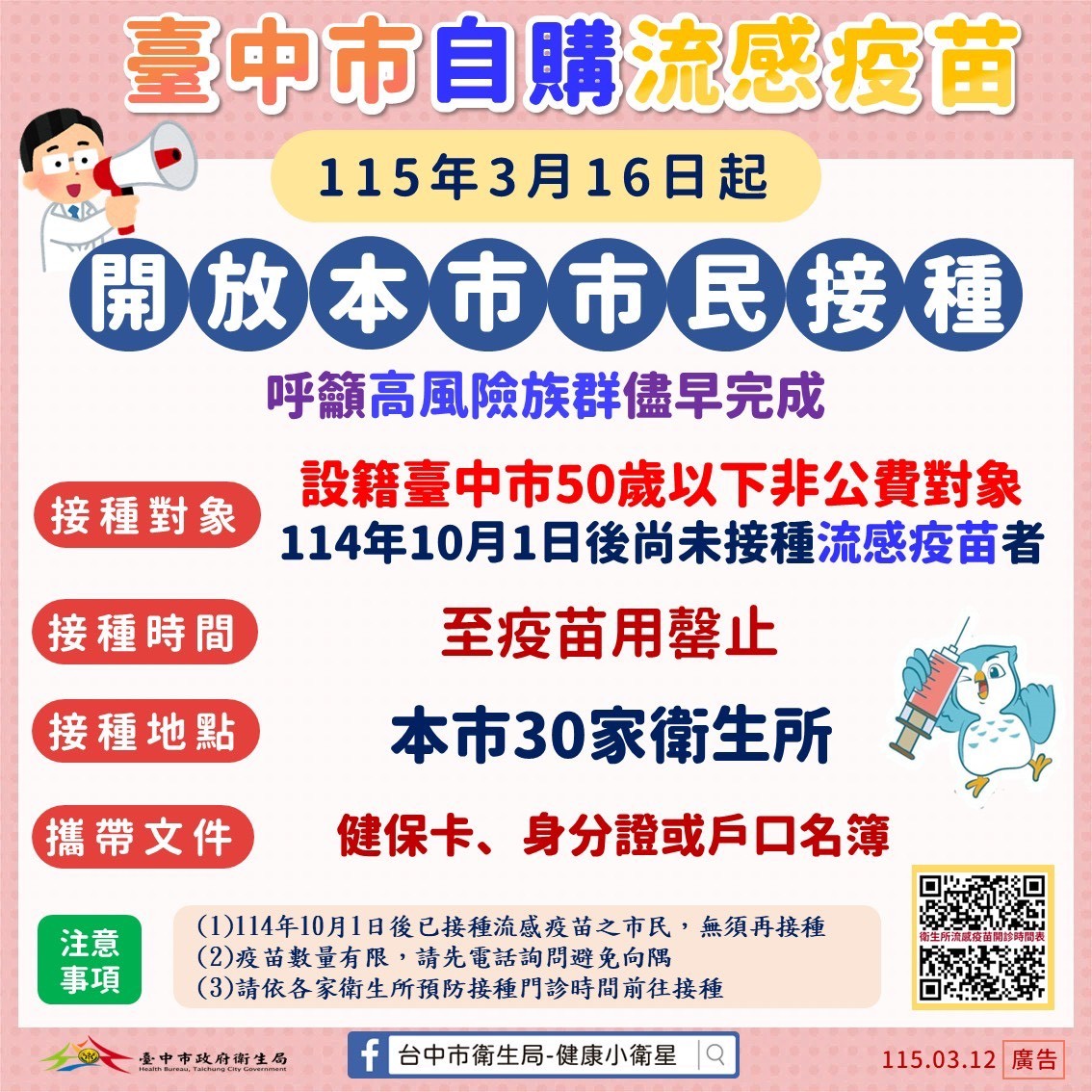 🔔提供施打對象為:設籍臺中市50歲以下非公費對象之市民(114101日後尚未接種過流感疫苗)