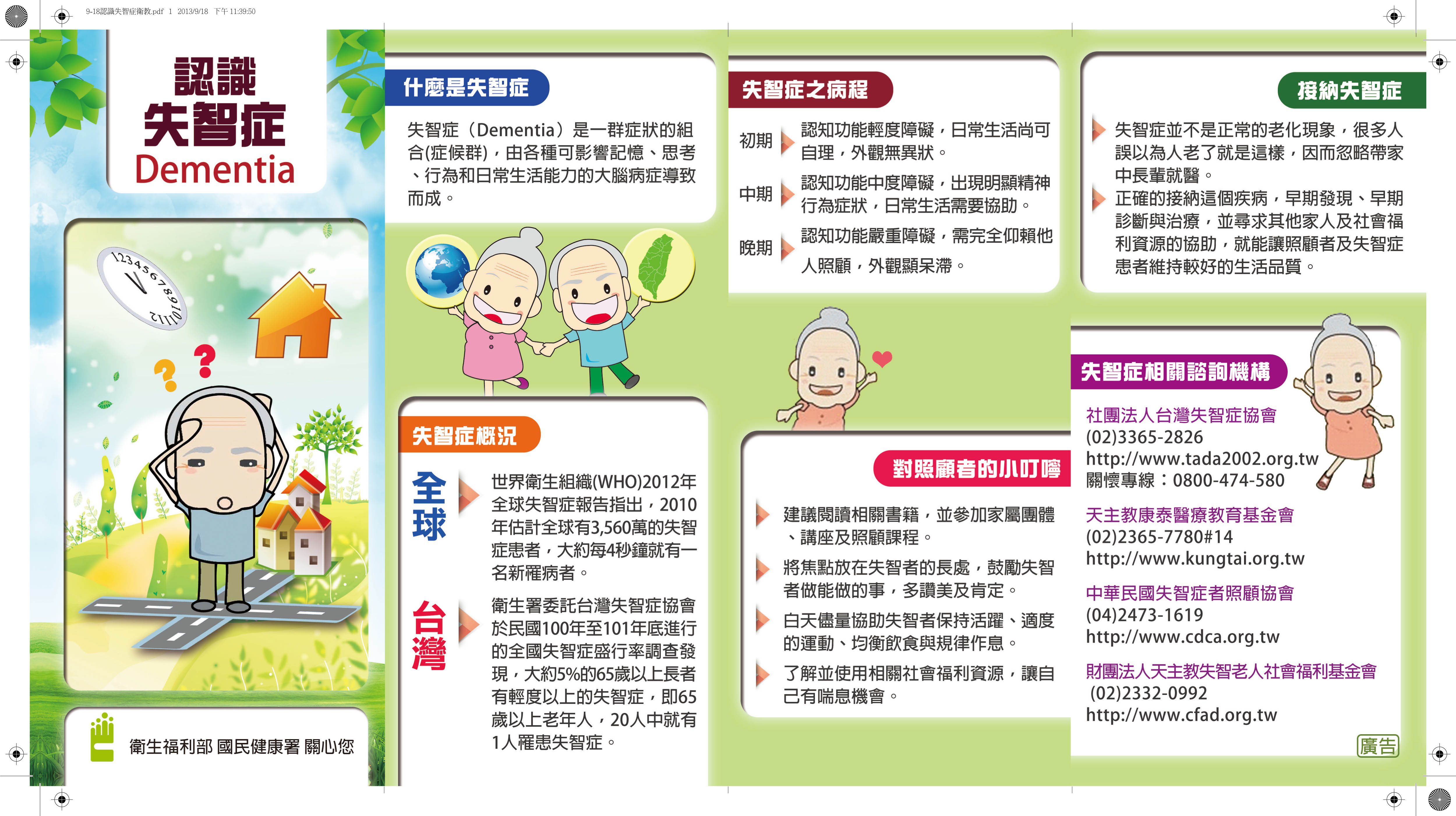 認識失智症 認識失智症單張簡介為提高長者及社會大眾對於失智症的瞭解,本單張說明失智症的症狀、如何預防失智症與家人有失智症後可尋求之社會資源。藉由大眾對失智症有較正確的認知和理解,鼓勵疑似症狀出現時儘早就醫尋求專業協助,並幫助社會大眾對失智症患者有正確的接納態度。資料來源:衛生福利部國民健康署/健康九九網站